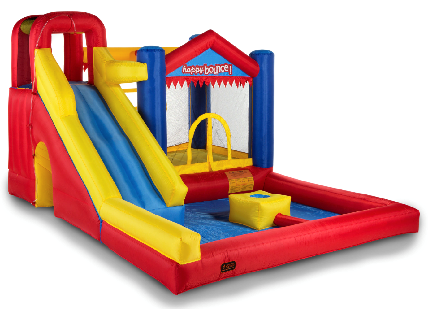Het Waterslide 8-1 springkussen is een springkussen met een waterglijbaan, speeleiland, klimwand, kruiphok en een basketbalnet. De afmeting is 400 x 320 x 250 cm. Het springkussen wordt standaard geleverd inclusief blower, opbergtas, haringen en een reparatieset. De blower zorgt ervoor dat het springkussen gemakkelijk binnen enkele minuten staat. Het springkussen is dubbel gestikt en netjes afgewerkt. Daarnaast zit er rondom het springkussen een stevig zwart nylon net.